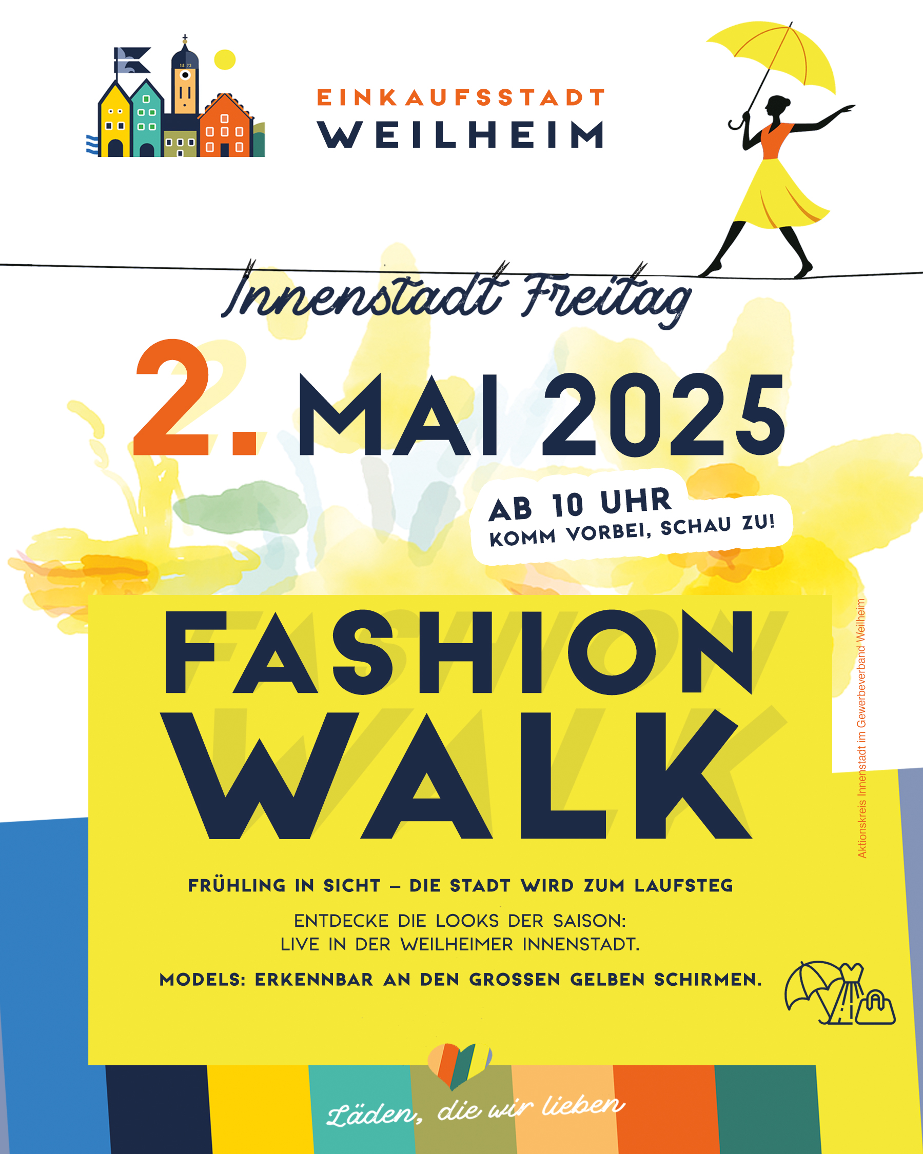 Vorhang auf, mit unserer wunderbaren Altstadt als Bühne! Weilheim wird zum Laufsteg, wenn am 2. Mai 2025 durch die Innenstadt Models flanieren. Sie zeigen die Frühjahrs-Kollektionen der Bekleidungsgeschäfte, Boutiquen und Modehäuser unserer Stadt und sind gut zu erkennen an ihren großen gelben Schirmen mit Firmen-Logo. Diese tolle Aktion hatte bereits 2024 mit großem Erfolg und viel Spaß stattgefunden (Foto).