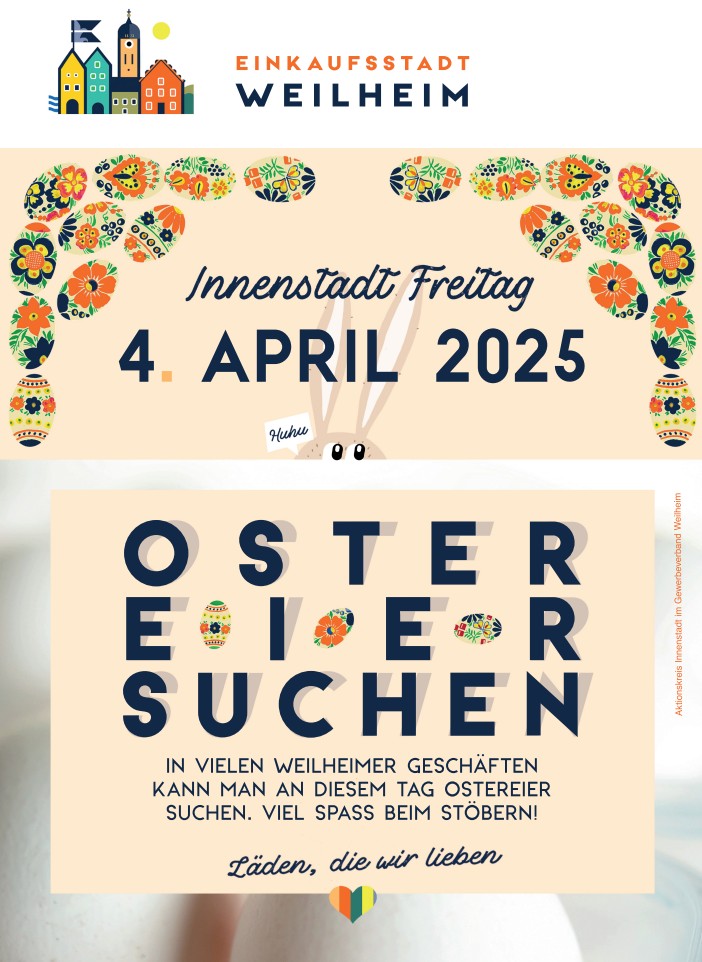 Am Freitag, den 4. April 2025, lädt der Weilheimer Innenstadt-Freitag erneut zum besonderen Innenstadterlebnis ein. Passend zur beginnenden Osterzeit erwartet Familien und Kinder eine große Ostereiersuche in vielen Geschäften der Weilheimer Innenstadt.
