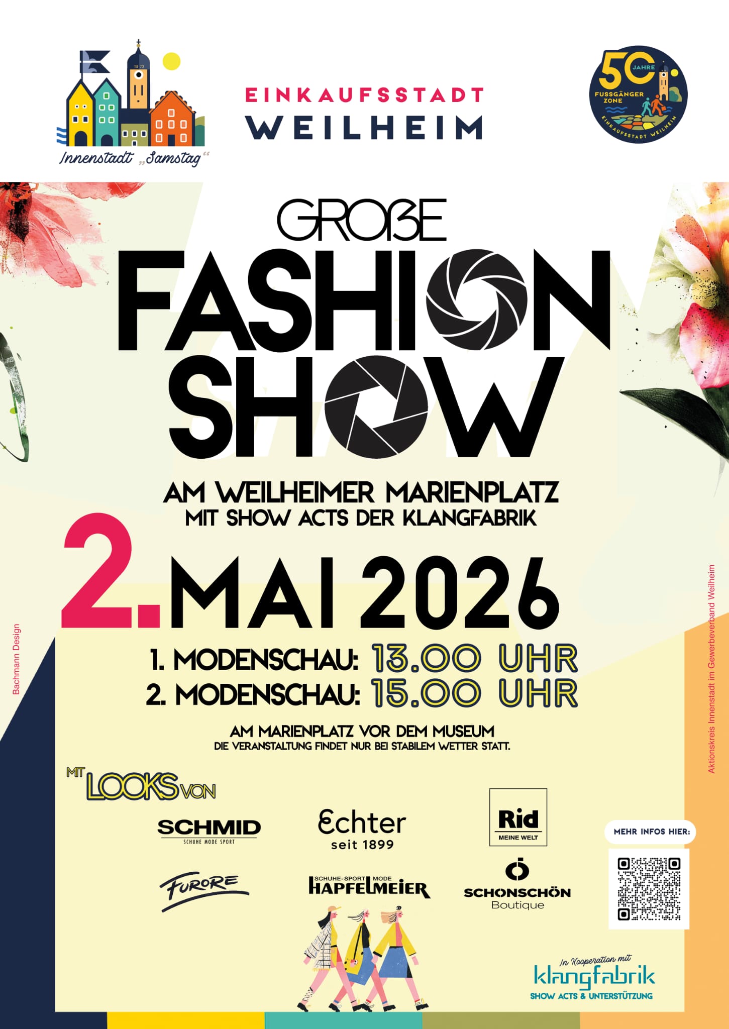 Herzlich Willkommen zum Innenstadtfreitag in Weilheim in Oberbayern! So heißt es jeden ersten Freitag im Monat. An diesem Tag zeigt sich der Einzelhandel in der Weilheimer Innenstadt von seiner noch vielfältigeren Seite - verlängerte Öffnungszeiten, verbunden mit einem besonderen Event. Ob aus Starnberg oder Tutzing, ob aus Seeshaupt, Penzberg oder Peißenberg - kommen Sie zum Shoppen in die Kreisstadt des Oberlandes! Genießen Sie bis mindestens 19 Uhr die persönliche Beratung und den entspannten Einkauf in freundlicher Atmosphäre, und seien Sie gespannt auf das abwechslungsreiche Event-Programm, das wir für Sie als Schmankerl bereithalten!
