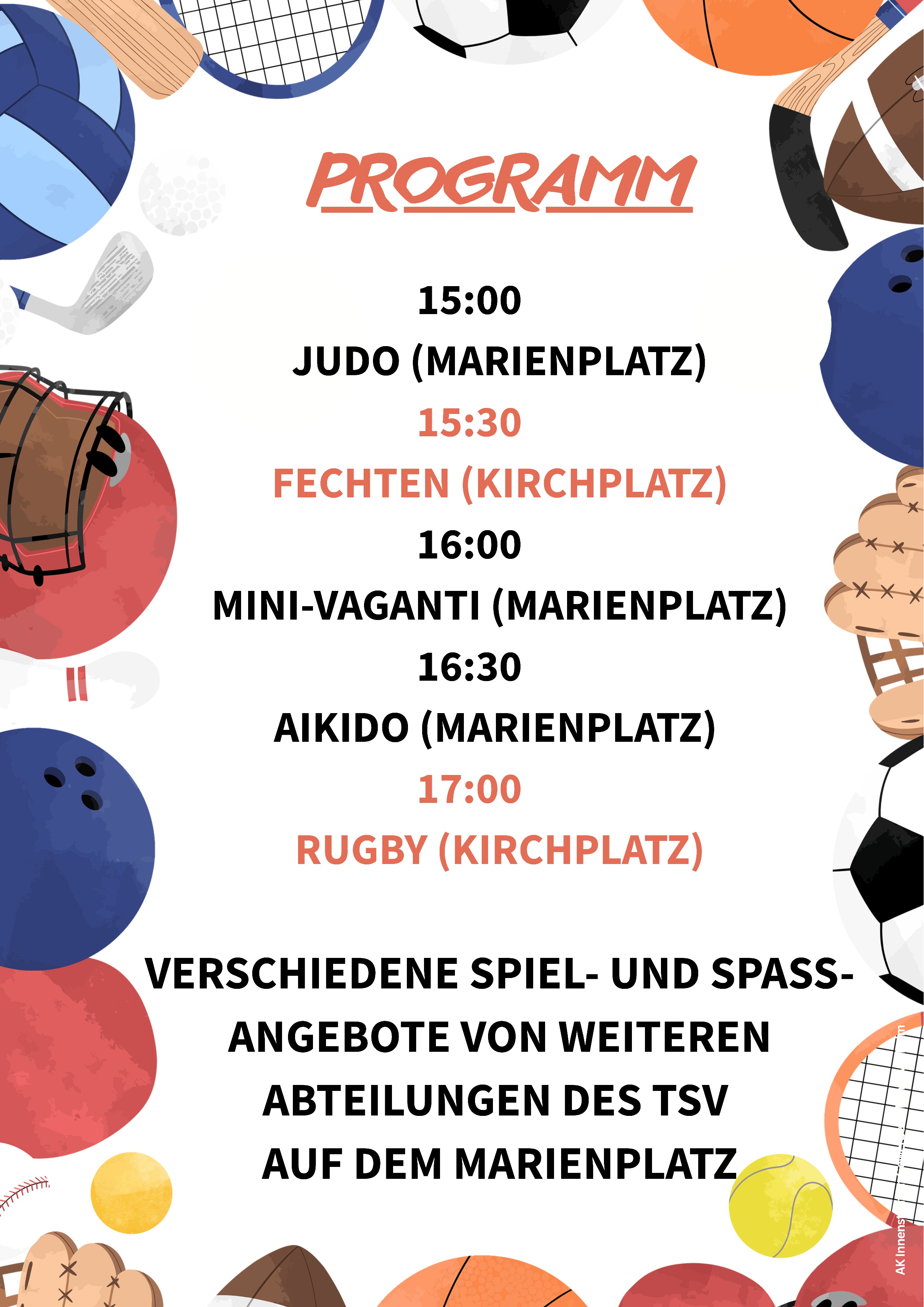 Am 10.10.25 ab 15:00 Uhr verwandeln der TSV 1847 Weilheim und seine Abteilungen den Marienplatz und Kirchplatz in eine große Sportarena. Besucher aller Generationen können sich auf Vorführungen, Mitmachaktionen und spannende Einblicke in die Vielfalt des Vereinslebens freuen.