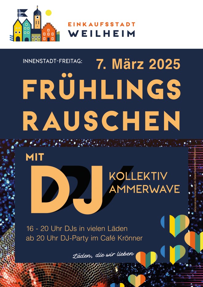 Weilheim ist eine Einkaufsstadt, die sich hören lassen kann! Das DJ-Kollektiv "Ammerwave" wird uns am 7.März 2025 mit ihren elektronischen Beats munter auf den Frühling einstimmen, jetzt, wo die Temperaturen allmählich milder werden und uns schon bald das erste frische Grün umgibt. Lassen Sie uns beim Shopping in Weilheim die Vorboten des Frühlings feiern - mit DJs, die von 16 bis 20 Uhr in einer ganzen Reihe von Geschäften auflegen!